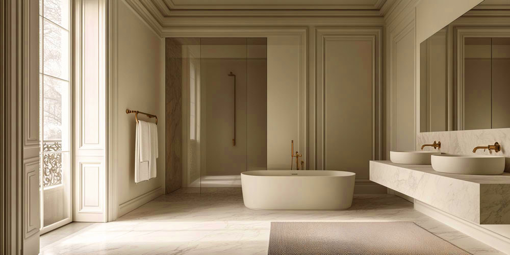 Płytki imitujące trawertyn ułożone w jodełkę spotykają się z wanną na lwich łapach z mosiądzu. Umywalka konsolowa z różowego onyksu zdaje się unosić nad podłogą, a lustro w ramie ze starego okna dodaje przestrzeni historycznego sznytu. W niszy prysznicowej – miedziana deszczownica inspirowana paryskimi bains-douches