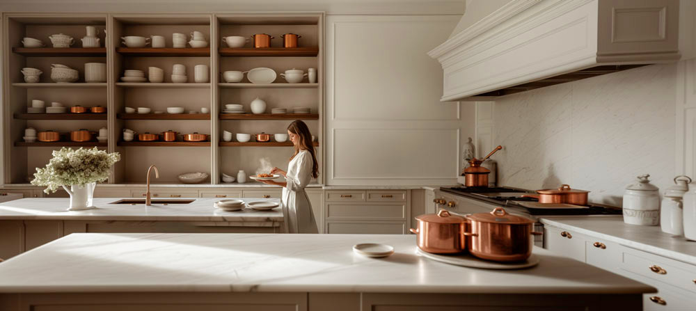 Zachowaliśmy industrialny pochłaniacz, któremu przeciwstawiliśmy nową zabudowę w kolorze French Gray (Benjamin Moore). Wyspa kuchenna z marmuru Calacatta Gold stała się centrum spotkań, ozdobiona mosiężnymi uchwytami w kształcie gałązek oliwnych. Nad nią – lampy z papier-mâché przypominające kwiaty magnolii, rzucające miękkie cienie na ręcznie malowane kafelki w odcieniu Bleu de Roi